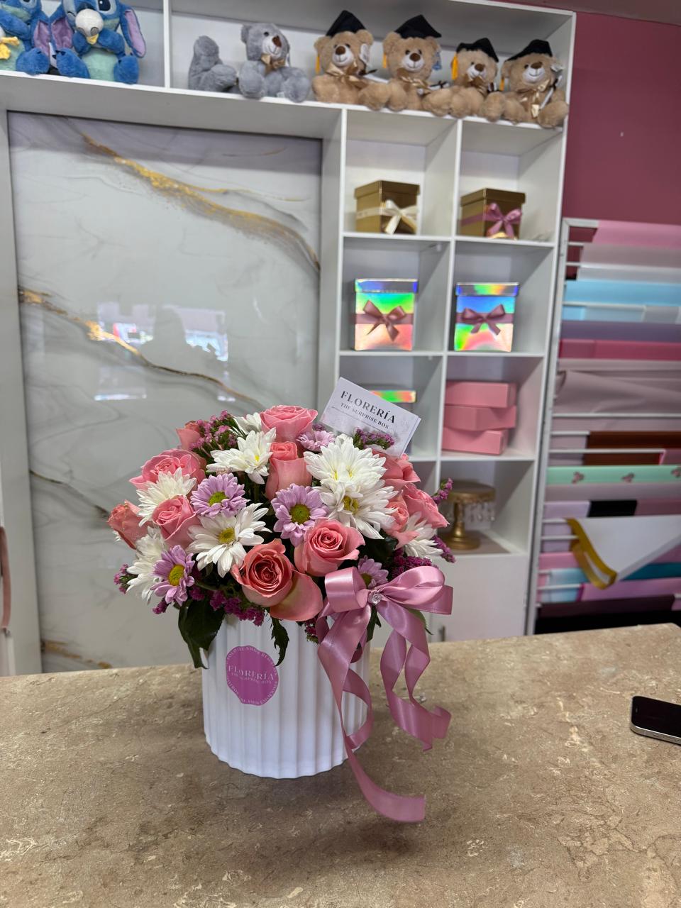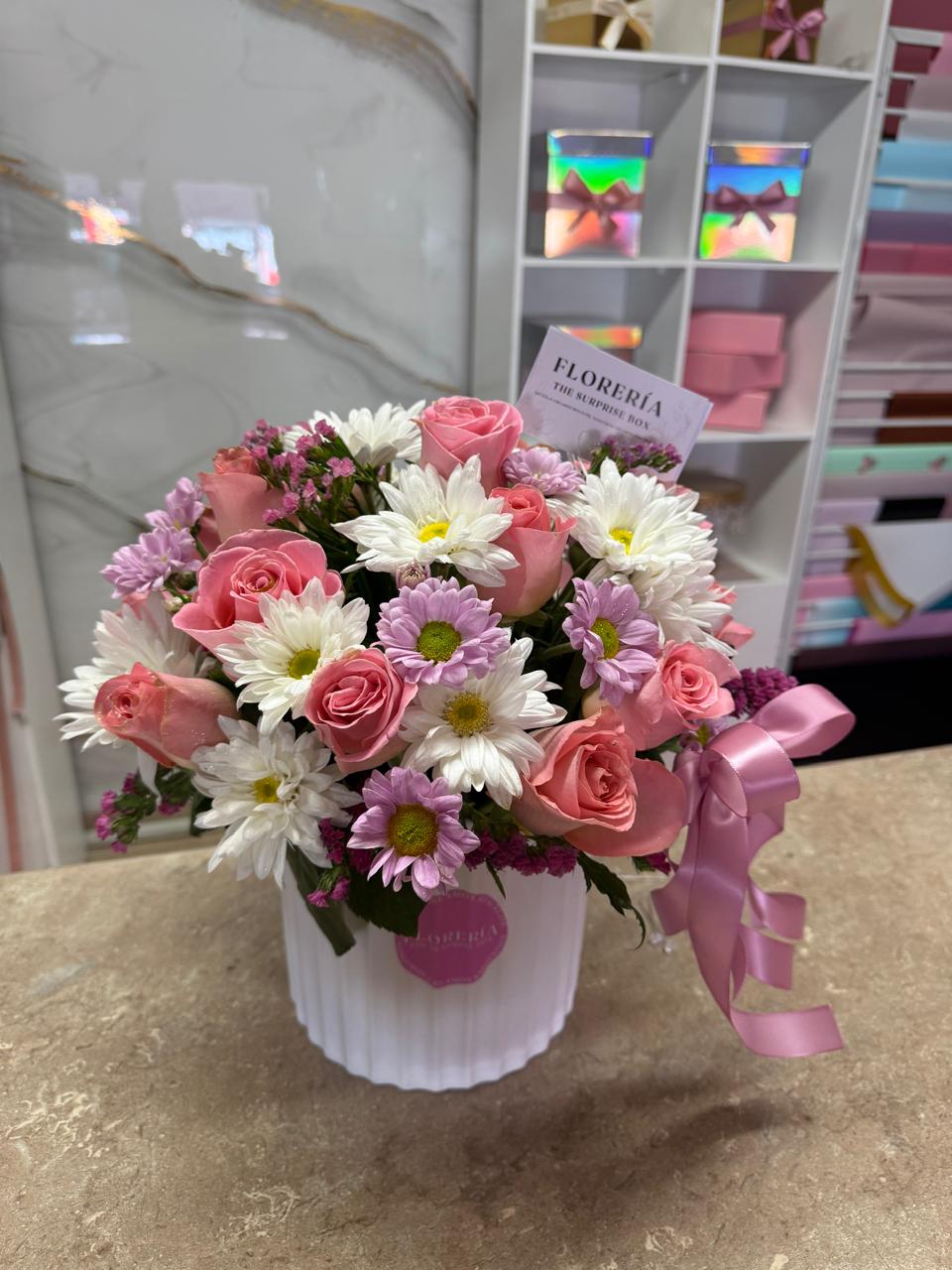 Variedad de margaritas y rosas en jarrón.