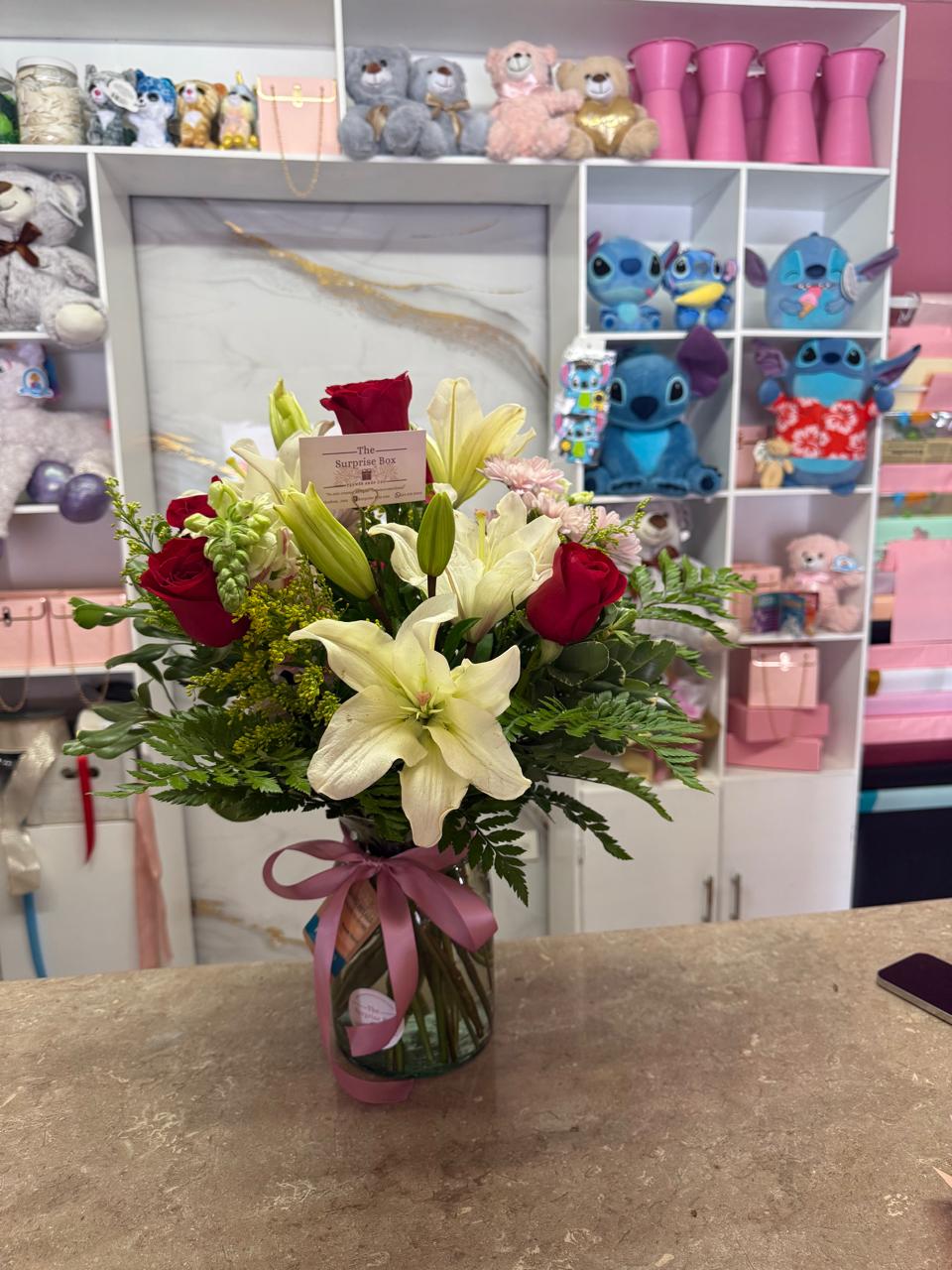 Jarrón con rosas rojas, lirios y follaje premium