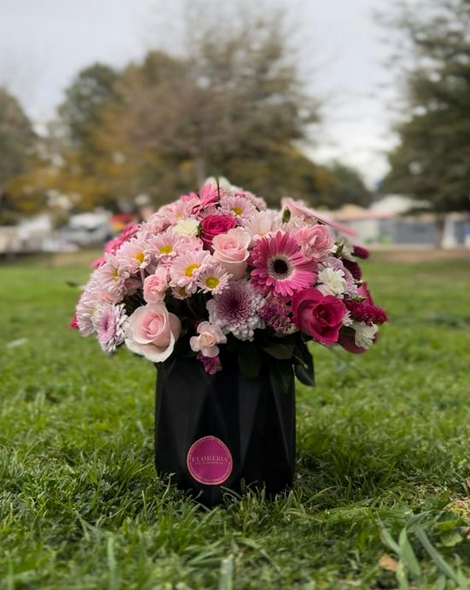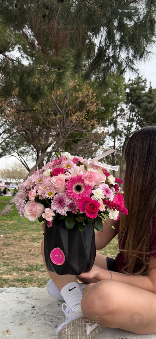 Jarrón con variedad de flores como rosas, gerberas, margaritas.